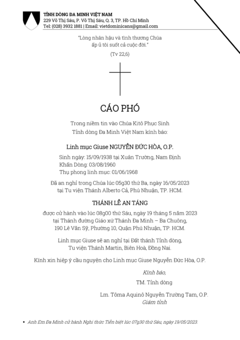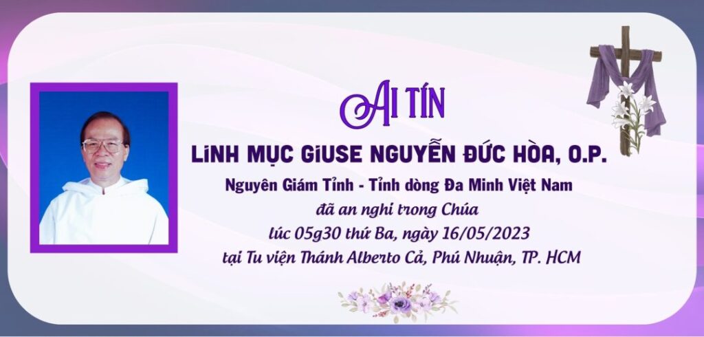 Trang chủ » Tin tức » Tỉnh Dòng Đa Minh VN » Ai tín: Lm. Giuse Nguyễn Đức Hòa O.P – Nguyên Giám tỉnhAi tín: Lm. Giuse Nguyễn Đức Hòa O.P – Nguyên Giám tỉnh 334 lượt xem 16 Tháng 5, 2023