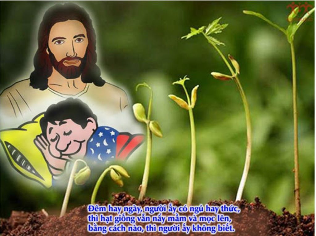 Người nông dân không kéo mạnh thân cây lúa lên cho mau lớn để thu hoạch, nhưng chờ đợi. Trong khi chờ đợi, người nông dân đó ngủ và nghỉ ngơi cầu xin cho được “mưa thuận gió hòa”. Và thiên nhiên chuẩn bị cho mùa màng, nhưng Đấng Tạo Hóa hoạt động qua các yếu tố đó mà người ta vô thức. Tin mừng nói: “Nước Thiên Chúa giống như người gieo hạt giống xuống đất. Đêm hay ngày người ấy có ngủ hay thức, hạt giống vẫn nảy mầm và mọc lên, bằng cách nào thì người ấy không biết”. Đây là một trong những dụ ngôn Chúa Giêsu dùng để ám chỉ Nước Thiên Chúa. Đúng thế, mọi sự xẩy ra như thể không có ai chăm sóc cho hạt giống Nước Trời đã gieo vào lòng đất, như thể bác nông dân không quan tâm đến hạt giống đã gieo.