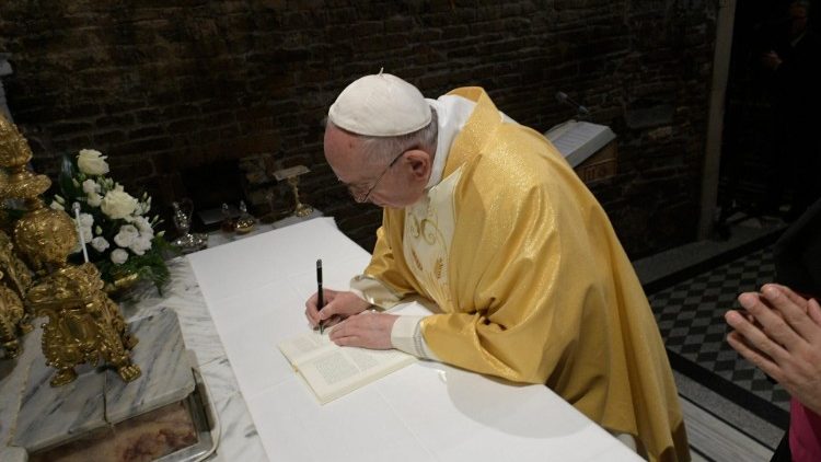 ĐTC ký Tông Huấn trên đây trên bàn thờ, trước tượng Đức Mẹ Loreto, vào cuối thánh lễ ngài cử hành trong Nhà Thánh, Nhà của Đức Mẹ ở Nazareth, nơi Thiên Thần truyền tin cho Đức Maria, được đưa từ Thánh Địa về đây. Qua cử chỉ này, ngài muốn phó thác cho Mẹ Thiên Chúa hành trình Hậu Thượng HĐGM về giới trẻ cũng như chương trình đẩy mạnh việc mục vụ giới trẻ, mục vụ ơn gọi trong Giáo Hội.