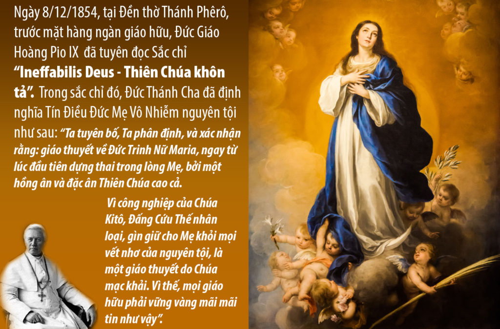Mừng Lễ Mẹ Vô Nhiễm hôm nay, mỗi người chúng ta hãy một lần nữa quyết tâm noi gương Mẹ, cậy nhờ Mẹ và hãy cùng với Mẹ tín thác vào Lòng Thương Xót vô biên của Chúa, vì “muôn ngàn đời Chúa vẫn trọn tình thương”. Chính nhờ Đức Giêsu mà mỗi chúng ta được hưởng ân phúc Nước Trời, và cũng chính nhờ Đức Giêsu Kitô, mà chúng ta có một người mẹ vô cùng thánh thiện và tuyệt vời trinh trong. Mừng lễ Mẹ Maria Vô Nhiễm hôm nay, chúng ta Tạ ơn Chúa đã thương tuyển chọn gìn giữ và bảo vệ sự trong trắng vẹn tuyền của Mẹ. Đồng thời cũng là dịp nhắc cho mỗi chúng ta nhớ rằng, chúng ta cũng đã được Thiên Chúa tuyển chọn và thánh hóa trong ngày chúng ta lãnh Bí Tích rửa tội. Nhờ đó chúng ta trở nên một tạo vật mới trong trắng tinh tuyền trước mặt Thiên Chúa, đồng thời chúng ta cũng được thánh hiến để thân xác chúng ta trở nên đền thờ của Chúa Thánh Thần và linh hồn chúng ta là đề thờ của Thiên Chúa Ba ngôi cư ngụ.