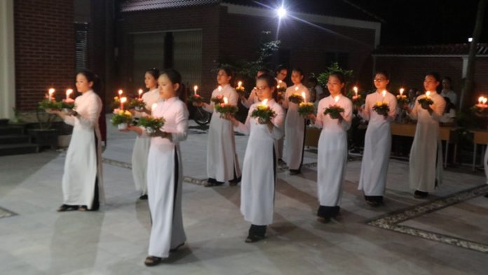Chương trình mừng lễ được kết thúc với phần dâng hoa kính Mẹ. Có thể nói đây là giây phút lắng đọng và trọng tâm của một buổi tối hồng phúc, bởi chị em đang sống trong hai ngày cuối cùng của tháng 5, tháng dâng hoa kính Mẹ. Mười hai chị em, trên đôi tay cầm nến sáng lung linh giữa những bông hoa khoe sắc hòa trong lời hát “ Vòng Hoa Dâng Mẹ”
