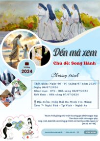 Vì để được song hành với các bạn trẻ, đồng thời mong muốn giúp cho các bạn khám phá ra dấu chân mà Thiên Chúa đang song hành với các bạn trong cuộc đời. Hiệp hội Đa Minh Tin Mừng tổ chức khóa tìm hiểu ơn gọi “Hãy đến mà xem IV” với chủ đề: SONG HÀNH trong thời gian hai ngày: Từ ngày 06 đến ngày 07 tháng 07 năm 2024. (Tức Chúa Nhật XIV Thường Niên)