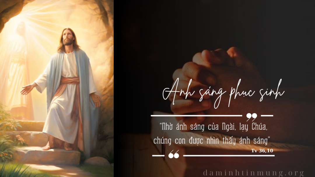 Ánh sáng Chúa Kitô”. Phụng vụ canh thức Vượt qua hôm nay khởi đầu và được dọi chiếu bởi yếu tố trung tâm là việc thắp nến và cung nghinh Ánh sáng. Đó là Ánh Vầng Đông, Ánh Sao Mai – Đức Kitô rọi chiếu trong khắp cõi nhân sinh. Quả vậy, cả vũ trụ nằm trong đêm tối đang mong đợi ánh sáng, nhân loại tội lỗi và chết chóc đang mong chờ ơn giải thoát. Trong đêm tối của cõi nhân sinh và vũ trụ ấy, “Ánh sáng Chúa Kitô” xuất hiện phá tan màn đêm đen tối. Ánh sáng bừng lên chiếu rọi người công chính. Niềm vui làm rạng rỡ kẻ lòng ngay” (Tv 96,11).