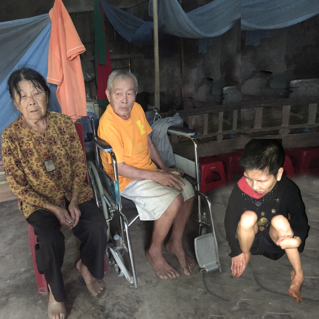 Chúng tôi dừng xe trước sân nhà ông bà Trần Văn Khấn. Nhìn vào trong, ông Khấn năm nay 90 tuổi, ngồi trên chiếc xe lăn 2 tay run cầm cập, môi miệng lắp bắp, nét mặt mừng rỡ chào đón chúng tôi, bên cạnh ông Khấn, chị Trần Thị Hồng sinh năm 1986, người con gái bị bại liệt bẩm sinh ngồi co ro dưới nền nhà.