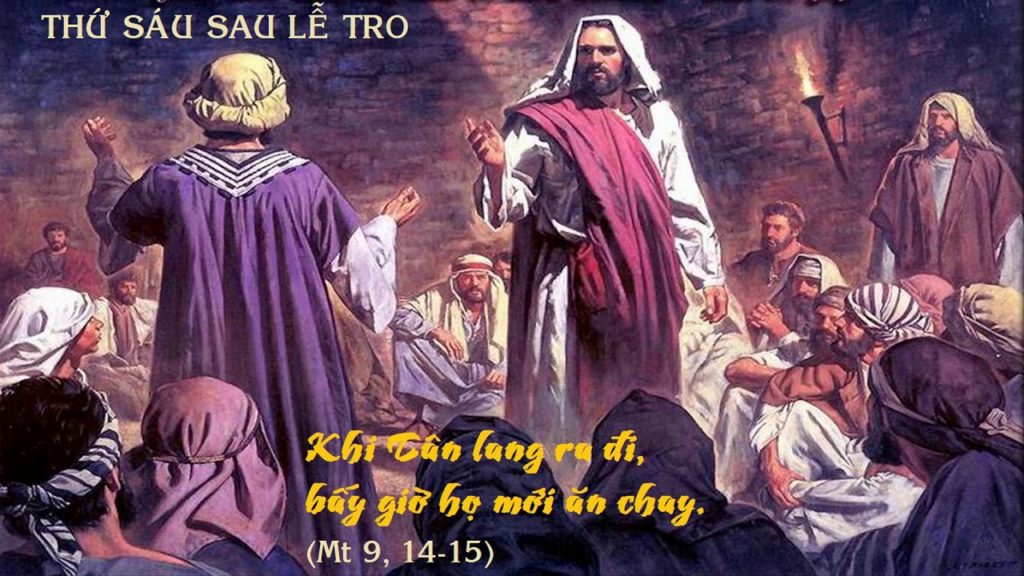 Trong bài tin mừng hôm nay, thánh sử Mát-thêu thuật lại chuyện các môn đệ của ông Gio-an Tẩy Giả đến gặp Chúa Giêsu để nói về việc ăn chay. Các môn đệ của Gioan thắc mắc tại sao Chúa Giêsu và các môn đệ của Người lại không ăn chay. Có lẽ, các ông cũng đã quan sát rất nhiều lần trước khi đến hỏi Chúa Giêsu. Không chỉ những người Pha-ri-sêu khó chịu trước hành động của Chúa Giêsu mà các môn đệ của Gioan cũng đến trách móc Người. Đáp lại câu hỏi đó, Chúa Giê su đã trả lời họ : “Chẳng lẽ khách dự tiệc cưới lại có thể than khóc, khi chàng rể còn ở với họ sao?”. Chúa Giêsu đã dùng một hình ảnh rất quen thuộc để các ông có thể hiểu. Không ai có thể than khóc trong lúc ngập tràn niềm vui cùng với chàng rể nơi tiệc cưới. Và các môn đệ của Chúa Giêsu cũng vậy, họ không thể ăn chay khi họ đang ở với chàng rể. Chàng rể đó chính là Chúa Giêsu. Họ không thể than khóc, đau khổ khi Chúa đang ở với họ. Các môn đệ Chúa Giêsu đang thật hạnh phúc khi được Chúa Giêsu là nguồn mạch niềm vui hiện diện sống động trong cuộc đời của họ dù có những lúc các ông chưa thể cảm nghiệm được. Niềm vui của các môn đệ Chúa phải là một niềm vui kéo dài. Bởi chính họ đang được sống trong nguồn mạch của niềm vui. Chính Chúa Giêsu cũng đã khẳng định không thể buồn sầu hay thất vọng khi Người đang ở cùng họ.