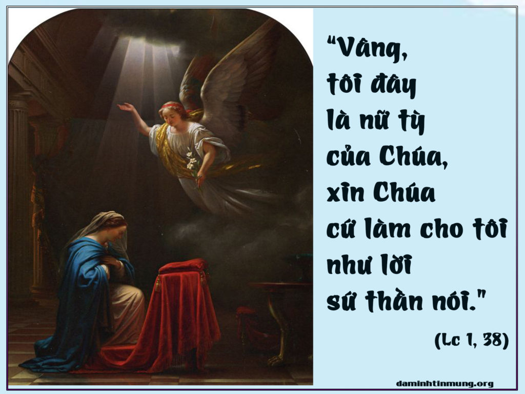 Thật vậy, Đức Maria đã tự nguyện trở thành tôi tớ của Thiên Chúa để cộng tác vào chương trình cứu chuộc nhân loại. Ngài đã trở nên một dụng cụ tuyệt vời của Thiên Chúa, hoàn toàn đặt mình dưới quyền sử dụng của Thiên Chúa như một tờ giấy trắng trước cây viết. Mẹ đã cưu mang Chúa trong thân xác qua biến cố truyền tin. Mỗi người chúng ta cũng đã cưu mang Chúa trong tâm hồn kể từ ngày lãnh nhận Bí tích Rửa Tội. Chúng ta được gọi là Ki-tô hữu, tức là chúng ta thuộc về Đức Ki-tô, là môn đệ của Thầy Giê-su chí thánh, đã và luôn tin cậy phó thác hoàn toàn vào Thiên Chúa. Vậy chúng ta có mở ngỏ cuộc đời mình cho ý định yêu thương của Ngài hay không? Chúng ta có bao giờ nghĩ rằng chính mình cũng đang được mời gọi: Hãy để cho Thiên Chúa “truyền tin” cho mình ngay giữa một thế giới đang bùng nổ về thông tin như hiện nay không? Và Thiên Chúa sẽ gửi đến cho chúng ta một bản tin như thế nào? Phải chăng đó chính là “Tin Mừng”, “Tin Vui”, “Tin Lành”, “Tin Tốt Đẹp”, “Tin Bình An”, “Tin Hy Vọng” cho mảnh đời đã có quá nhiều “tin buồn, quá nhiều “tin… tức” của chúng ta ? Và mỗi khi nhận được một “Tin Mừng” như thế, chúng ta có sẵn sàng mau mắn thưa Xin Vâng trước mọi biến cố, nhất là trong những nghịch cảnh của cuộc sống? Chúng ta có tìm ra được trong đó một nội dung Tin Mừng mà Thiên Chúa muốn truyền đạt tới chúng ta không?