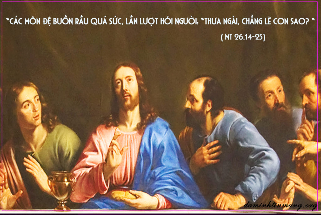 “CÓ NGƯỜI NỘP THẦY”: Ý định gian ác của Giuđa, tất nhiên chỉ có Giuđa biết, anh ta phải sắp xếp, lên chương trình trong sự âm thầm lặng lẽ, bởi nếu chỉ cần 1 kẽ hở thôi, thì Giuđa cũng chẳng thoát khỏi bàn tay của các môn đệ. Nhưng Giuđa có giấu kín và khéo léo bao nhiêu cũng không thể giấu Chúa được. Chúa thấu suốt mọi ý định của Giuđa, nhưng Ngài cho Giuđa quyền tự do chọn lựa; Ngài chỉ gợi mở cho Giuđa biết rằng việc mình làm là sai “khốn cho kẻ nào nộp Con Người, thà nó đừng sinh ra thì hơn” (c.24). Ngài không la ó, khiển trách, hay tìm cách loại bỏ, diệt trừ anh nhưng dùng đôi mắt và trái tim yêu thương để thức tỉnh lòng anh. Tiếc thay, cho dầu được Thầy dạy dỗ, yêu thương, chỉ bảo để Giu-đa nhận diện tội lỗi thầm kín của mình mà anh vẫn không tỉnh.