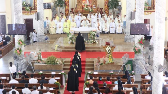 Đến 9 giờ, Thánh lễ do Đức Cha Phaolo cử hành cùng với đoàn đồng tế, có sự tham dự đông đảo của các nam nữ tu sĩ, quý ông bà cố, quý thân nhân, ân nhân, quý khách xa gần cùng toàn thể chị em trong gia đình Hiệp hội.
