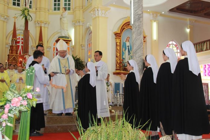 Đặc biệt, chúng con xin dâng lên Chúa 5 Tân khấn sinh hôm nay đã kí kết giao ước tình yêu với Đấng lang quân. Nguyện xin Chúa qua lời bầu cử của Mẹ Maria Mân Côi, Thánh cả Giuse, Cha Thánh Đa Minh ban ơn nhiệt thành, lòng yêu mến, sự tận tâm, hy sinh, hăng say dấn thân phục vụ trong khiêm tốn để các chị là những người chị tiên khởi, đi bước trước thực hành sứ vụ loan báo Tin Mừng của Hiệp hội đến cho con người trong thế giới hôm nay.