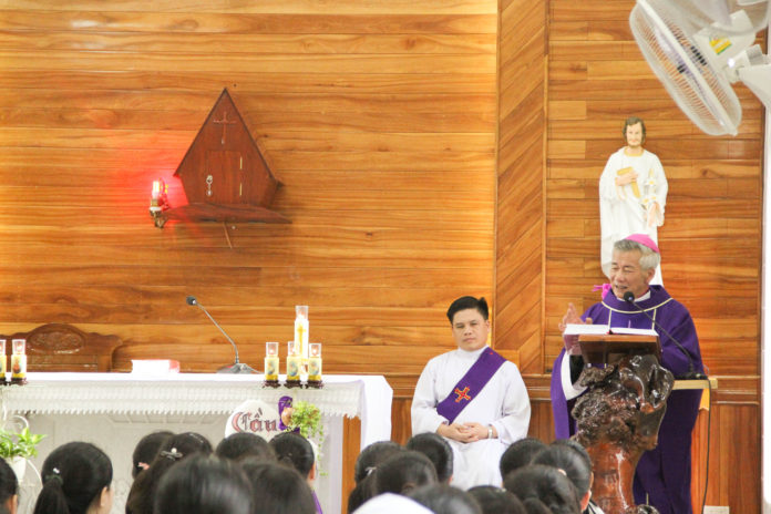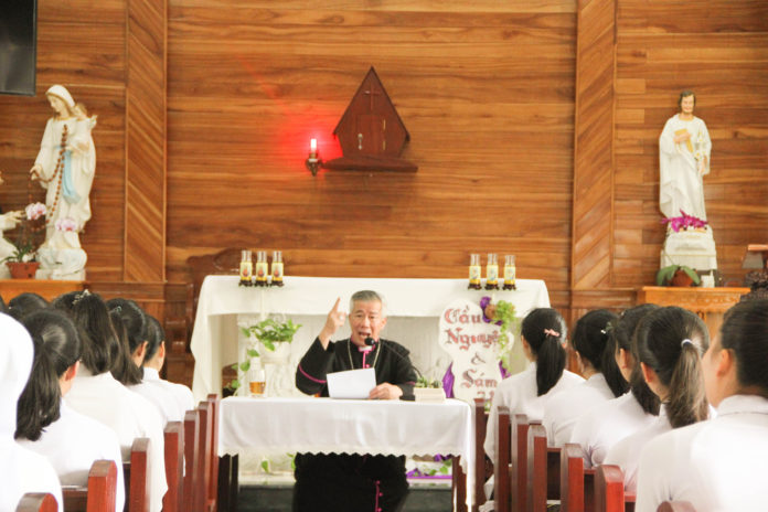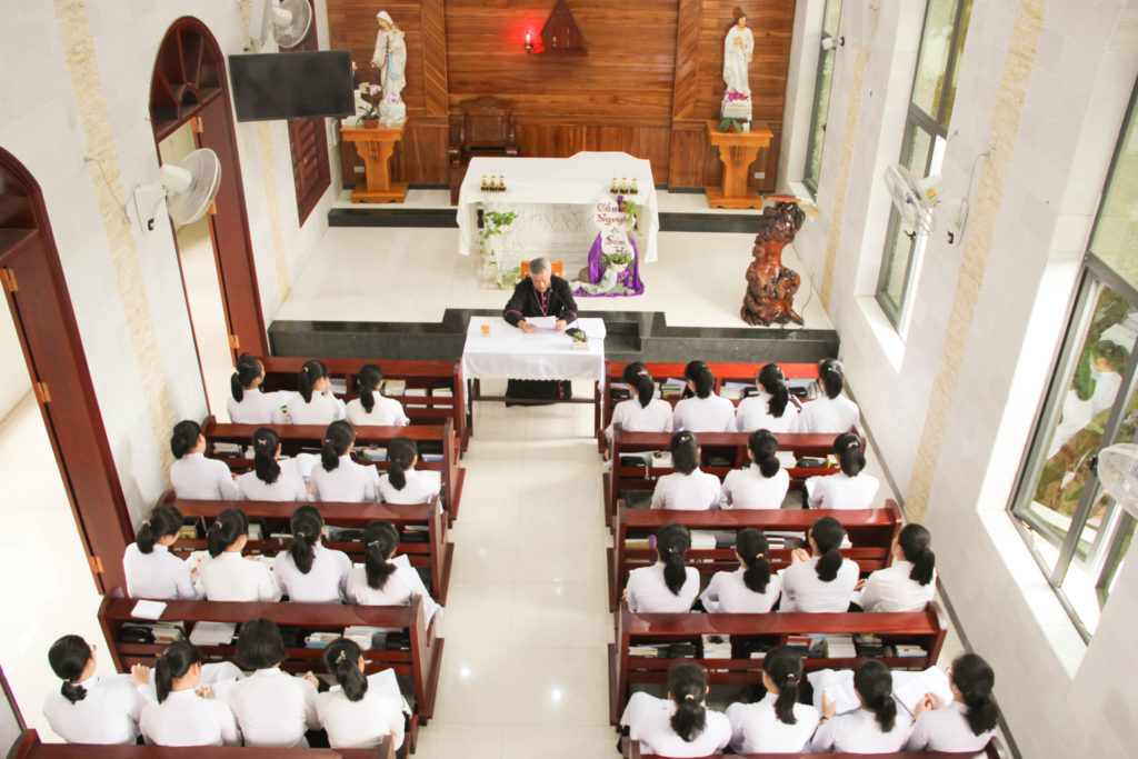 Chúa Nhật I mùa Chay năm nay nhằm đúng ngày 01/03. Như thường lệ, Hiệp hội Đa Minh Tin Mừng dành trọn ngày Chúa Nhật đầu tháng cho chị em hồi tâm, nhìn lại một tháng đã qua và định hướng sống cho tháng này. Lần tĩnh tâm này, thật diễm phúc cho chị em được Đức Cha Anphong Nguyễn Hữu Long – vị chủ chăn Giáo phận, tới giảng tĩnh tâm, dâng thánh lễ và .ở lại dùng bữa tối với chị em. Đức cha chia sẻ với chị em về đề tài: KHIÊM NHƯỜNG và SÁM HỐI