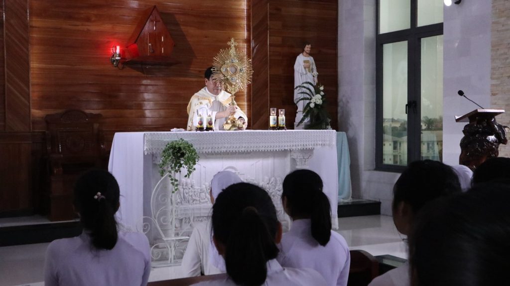 Sau những giờ thinh lặng bên Chúa Giê-su Thánh Thể, ngày tĩnh tâm được kết thúc bằng Thánh Lễ lúc 15g30, do Cha giảng phòng chủ tế. Thánh lễ diễn ra thật sốt sắng và một lần nữa, cùng với Giáo Hội, chị em được mời gọi lắng nghe và suy gẫm Lời Chúa với câu chuyện người đàn bà ngoại tình.