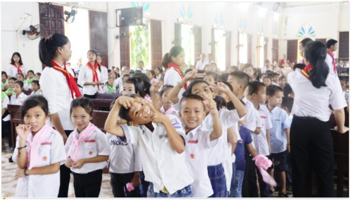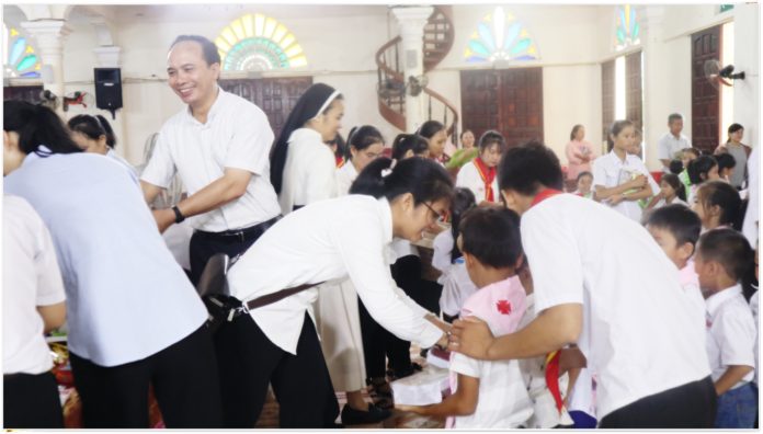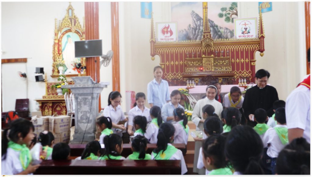 Tiếp tục hành trình, 2h chiều chúng tôi lên đường đến với giáo xứ Thu Chỉ. Chúng tôi đã trao gần 600 suất quà cho các em nơi đây. Thu Chỉ là một vùng quê nghèo nhưng học sinh rất hiếu học. Một em nhỏ mừng rỡ khi nhận được quà: “Cảm ơn các chị. Em vui lắm, em sẽ cố gắng học thật giỏi, từ nay em sẽ không phải mượn đồ dùng học tập của bạn nữa”.