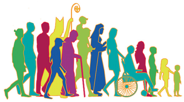 15 bóng người khái quát toàn bộ nhân loại trong sự đa dạng về hoàn cảnh sống, thế hệ và nguồn gốc. Điều này được mô tả bằng sự đa dạng của các màu sắc tươi sáng, vốn biểu trưng cho niềm vui. Không có tính chất phẩm trật giữa những người này, họ cùng bước đi trên một mặt đường phẳng: trẻ, già, nam, nữ, thiếu niên, trẻ em, giáo dân, tu sĩ, cha mẹ, người sống đời vợ chồng, người sống đời độc thân; giám mục và tu sĩ không đi trước mặt họ, nhưng ở giữa họ. Một cách hoàn toàn tự nhiên, trẻ em và thanh thiếu niên là những người mở đường cho họ, điều này liên hệ tới những lời của Chúa Giêsu trong Tin Mừng: “Lạy Cha là Chúa Tể trời đất, con xin ngợi khen Cha, vì Cha đã giấu không cho bậc khôn ngoan thông thái biết những điều này, nhưng lại mặc khải cho những người bé mọn”. (Mt 11,25)